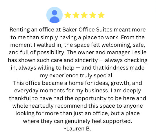 Baker Office Suites 1 and 2 offer flexible, professional office space designed for growing businesses, independent professionals, and small teams. Whether you need a quiet workspace or a collaborative environment, our suites provide comfort, convenience, and a professional image.
